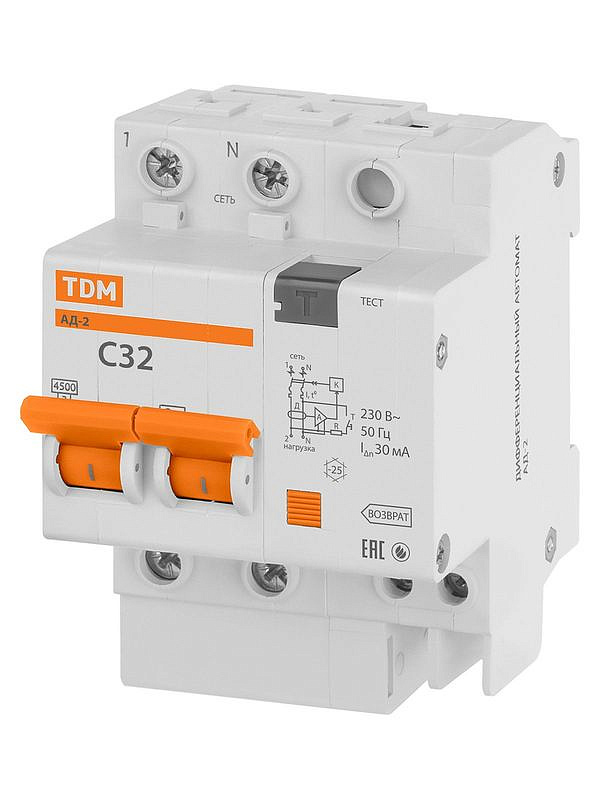 Диф.автомат АД-2 2Р 32А 30мА TDM | 30 |