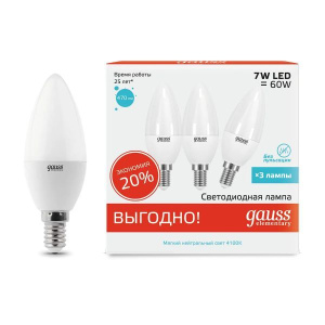 Комплект ламп Gauss LED Elementary Свеча 7W E14 4100K 1/40 (3 лампы в упаковке) | 40 |