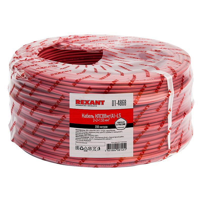 Кабель для пожарной сигнализации REXANT КПСВВнг(А)-LS 2x2x1,50 мм², бухта 200 м | 200 |
